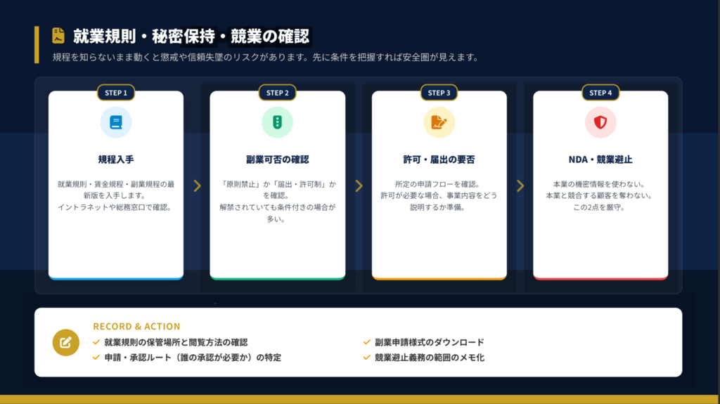 就業規則の「副業・兼業」「秘密保持」条文を探し、会社の申請フローを確認する(所要時間: 30分)