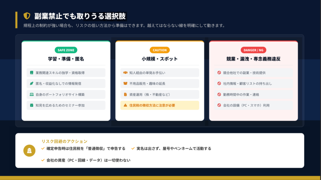 「うちの会社は副業禁止だから無理」と諦めていませんか。規程上の制約が強い場合も、リスクの低い領域から準備はできます。