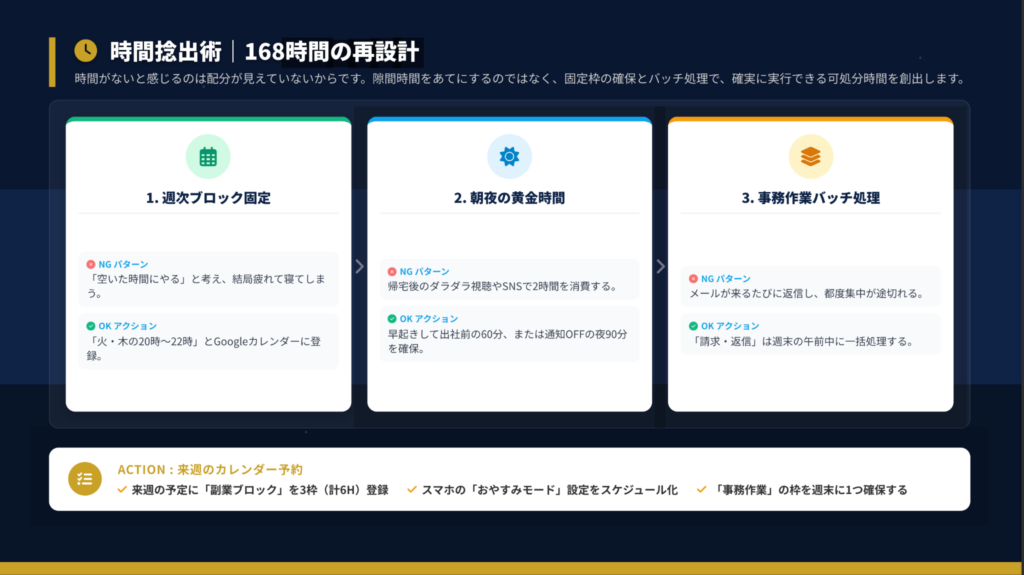 来週の予定に「副業ブロック」を3枠(計6時間)登録し、スマホの「おやすみモード」設定をスケジュール化する(所要時間: 15分)