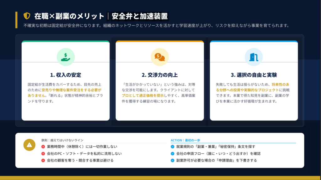 ただし、越えてはいけないラインが存在します。業務時間中には一切作業しない、会社のPC・ソフト・データを私的に流用しない、会社の顧客を奪う・競合する事業は避ける、という3点は厳守してください。