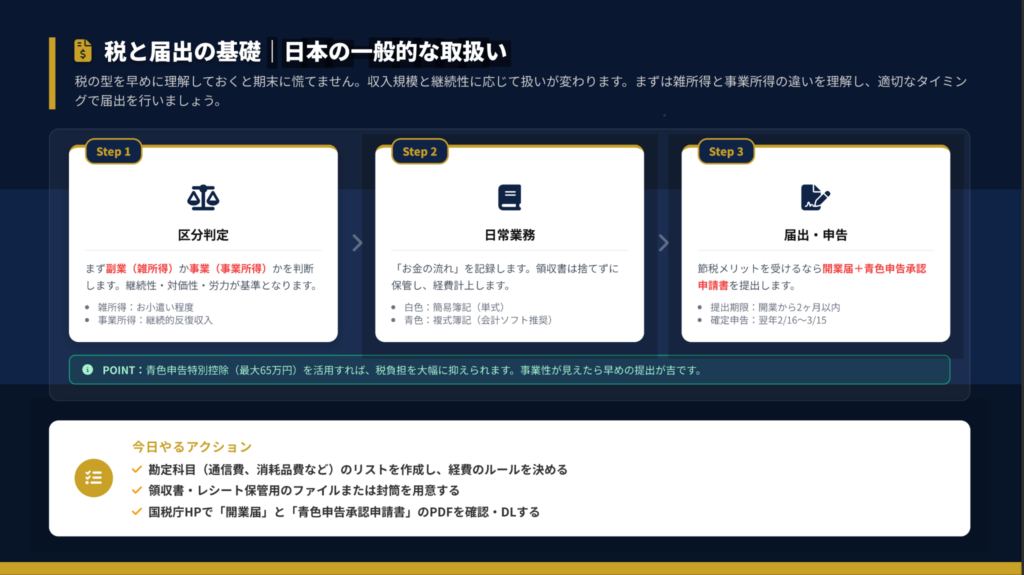 税の型を早めに理解しておくと期末に慌てません。収入規模と継続性に応じて扱いが変わります。