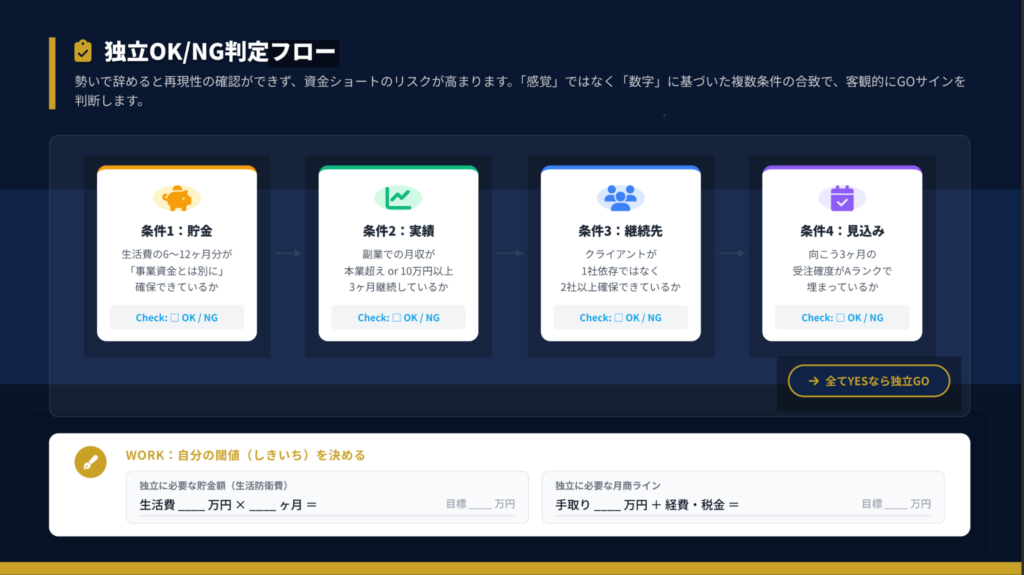 第三に、GO判定の4条件(貯金、実績、継続先、見込み)を全てクリアしてから独立することで、感覚ではなく数字に基づいた意思決定ができます。