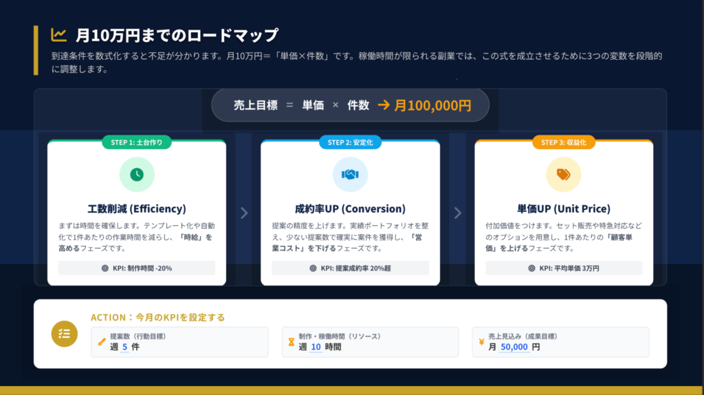 月10万円に届かない場合は、単価と件数のどちらがボトルネックかを分析してください。単価が低いなら商品設計の見直し、件数が少ないなら営業・提案数の増加が必要です。多くの場合、提案数を増やすことで突破できます。