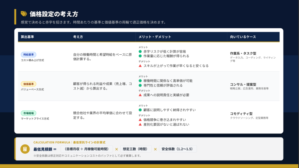 在職しながら副業を行う最大の強みは、固定給が生活費をカバーするため、目先の売上のために安売りや無理な案件受注をする必要がないことです。「断れる」状態が精神的余裕とブランドを守ります。