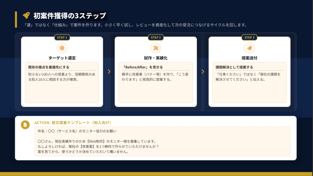 副業収入が月5万円未満既存人脈10件に短文提案を送付し、モニター案件を獲得する60分