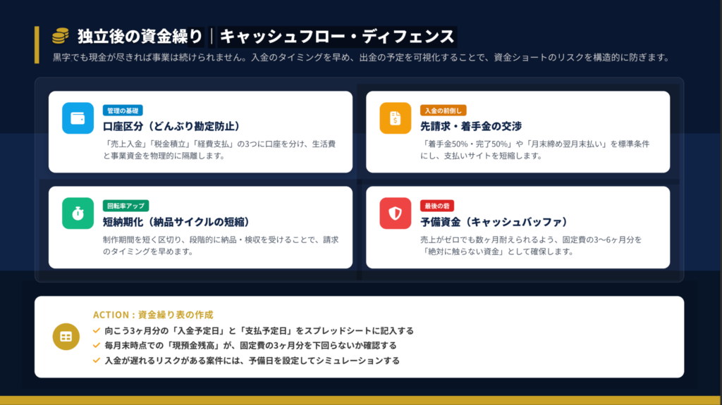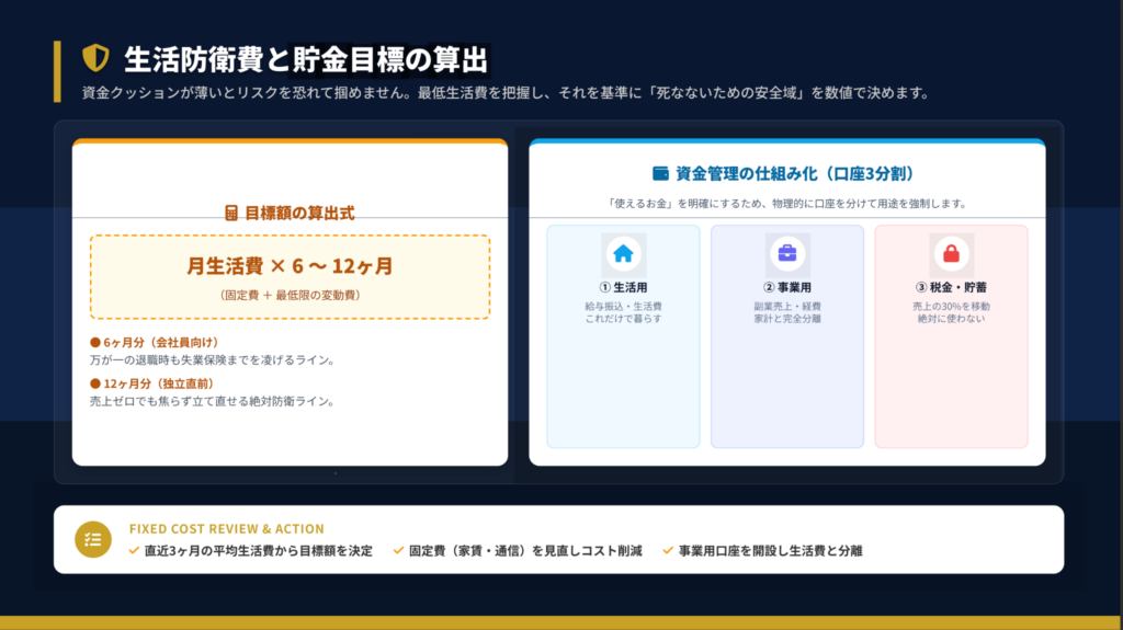 第二に、生活費6-12ヶ月分の貯金を「事業資金とは別に」確保することで、売上がゼロになっても焦らず立て直せる安全域を作れます。