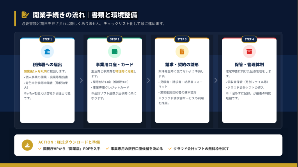 STEP 1:税務署への届出個人事業の開業届・青色申告承認申請書開業後1ヶ月以内(e-Taxで自宅から提出可能)節税効果を最大化したい人