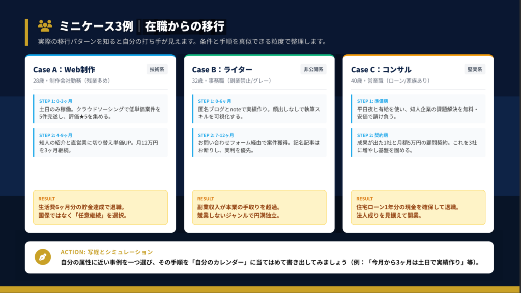 「自分と似た状況の人がどう独立したか知りたい」という声は多いです。実際の移行パターンを知ると自分の打ち手が見えます。