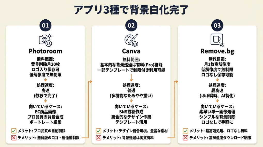 背景を白くするアプリは、Photoroom・Canva・Remove.bgの3つで、ほぼすべての用途をカバーできます。それぞれ無料範囲と得意分野が異なるため、用途に合った1つを選んでください。
