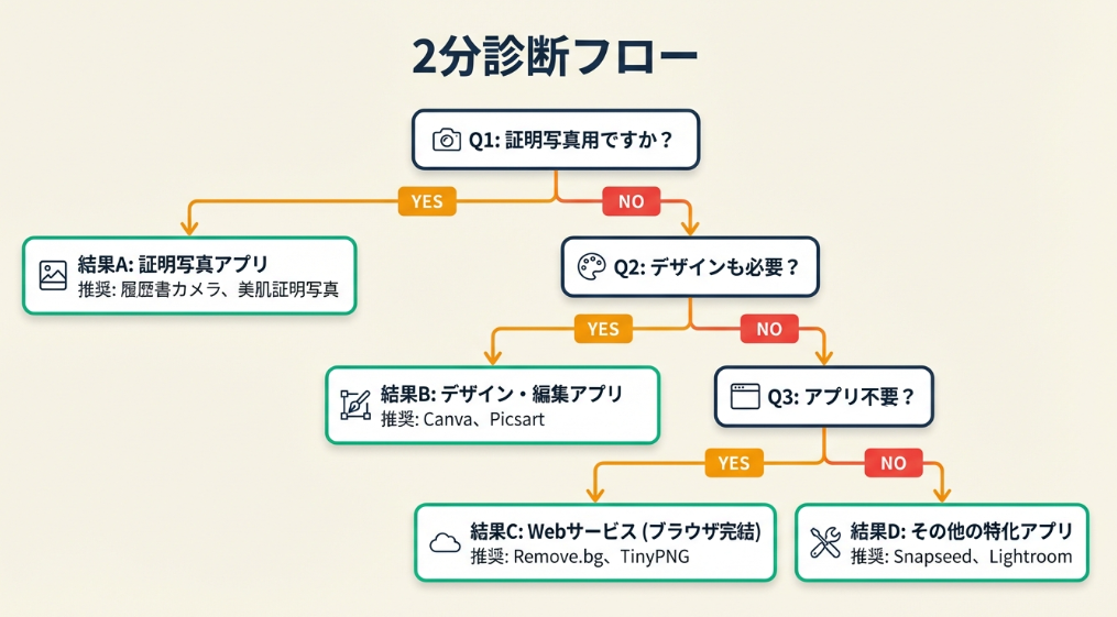 対応自体はできます。ただし証明写真の規格準拠やインスタのデザイン統一など場面ごとの要件が違うため、最適なアプリも変わります。迷ったらPhotoroomをベースにし、証明写真だけ専用アプリを使う組み合わせが効率的です。