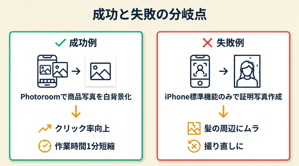 背景白化の成功パターンと失敗パターンを並べます。自分がどちらに近いか確認し、適切なアプリ選びに活かしてください。