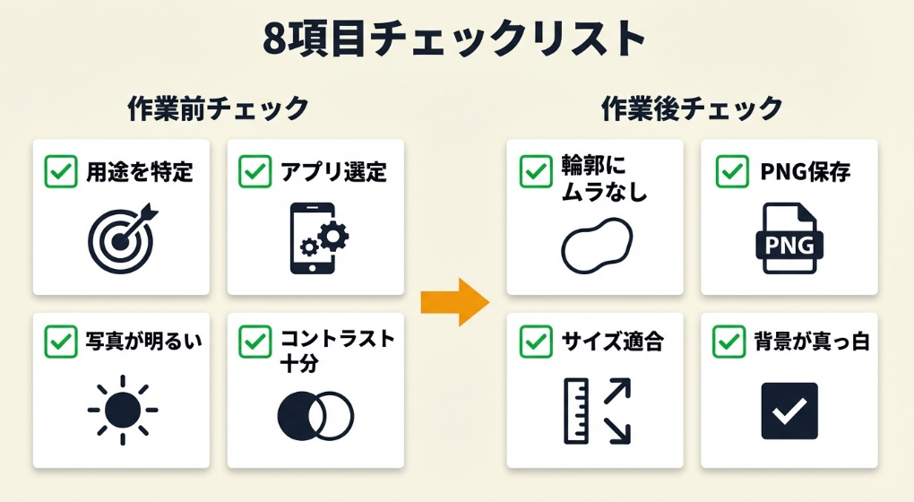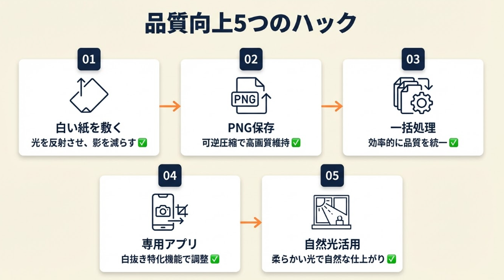 アプリで背景を白くするだけでは到達しない仕上がりの質を、撮影環境や保存形式の工夫で底上げできます。コストゼロで始められるものから順に紹介します。