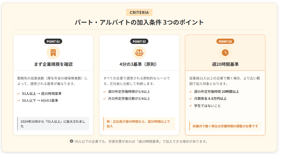 パート・アルバイトについては、2024年10月から従業員数51人以上の企業で適用拡大が進んでいます。週20時間以上・月8.8万円以上・2カ月超の雇用見込み・学生でないという4条件を満たすと加入対象です。