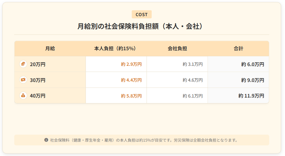 社会保険料は事業主と従業員で折半します。健康保険・厚生年金・雇用保険を合わせると、給与額の約15%前後が本人負担の目安です。
