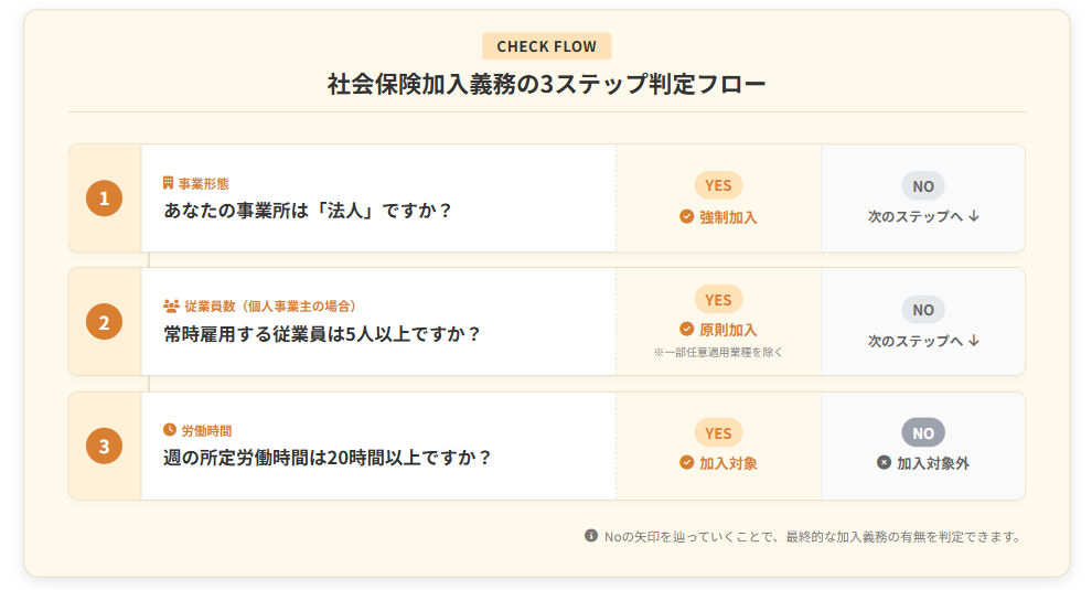 社会保険の加入義務は「法人か個人か」「従業員5人以上か」「週20時間・月8.8万円以上か」の3条件で判断できます。法人であれば役員1人でも強制適用となり、個人事業主は従業員5人以上で健康保険・厚生年金への加入義務が発生します。