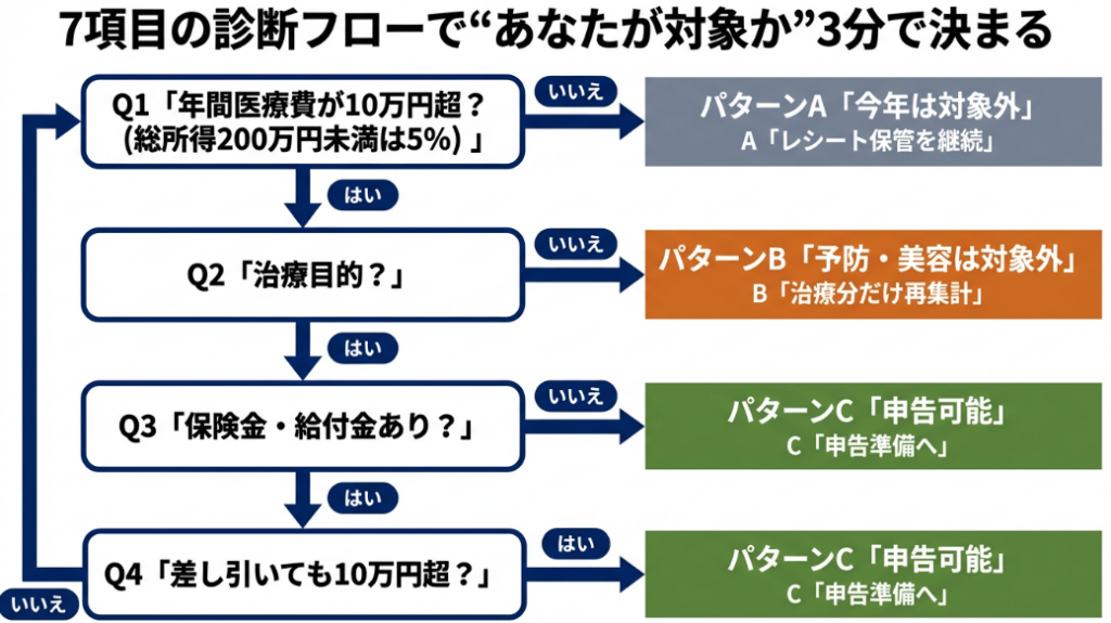 「自分の医療費は控除対象に該当するか?」を3分で判定できます。以下の診断フローで確認してください。