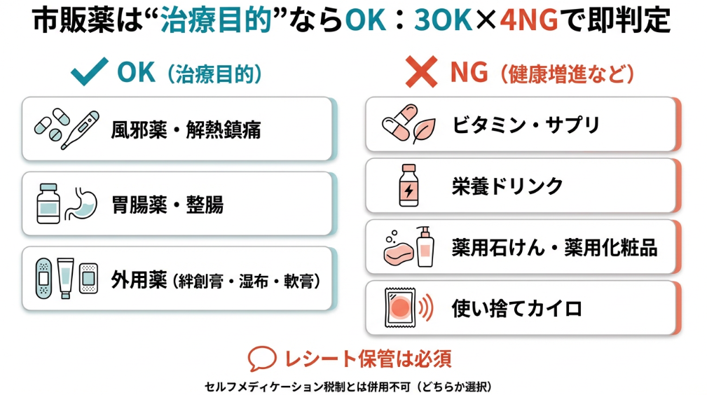 風邪薬、胃腸薬、頭痛薬など病気やケガの治療のために購入した市販薬は医療費控除の対象です。一方、ビタミン剤や栄養ドリンクなど健康増進や疲労回復が目的のものは対象外になります。