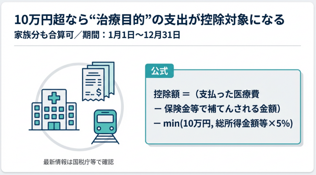 医療費控除は1年間の治療費が10万円を超えた場合に適用でき、家族分も合算できます。予防や美容目的の費用は対象外ですが、市販薬でも治療目的なら対象です。