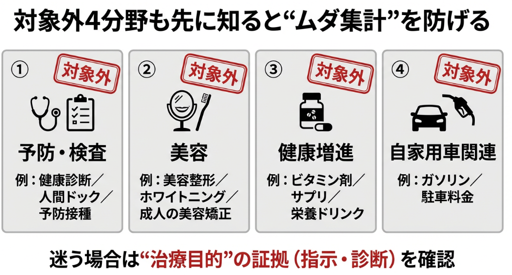 1. 予防・検査目的の費用 健康診断、人間ドック、予防接種(インフルエンザワクチン等)は対象外です。ただし、健康診断で異常が見つかり引き続き治療を受けた場合、治療費部分は対象になります。
