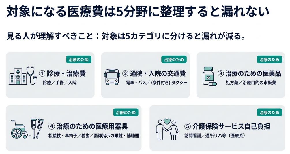 医療費控除の対象となる主な費用は以下の5分野に分類できます。