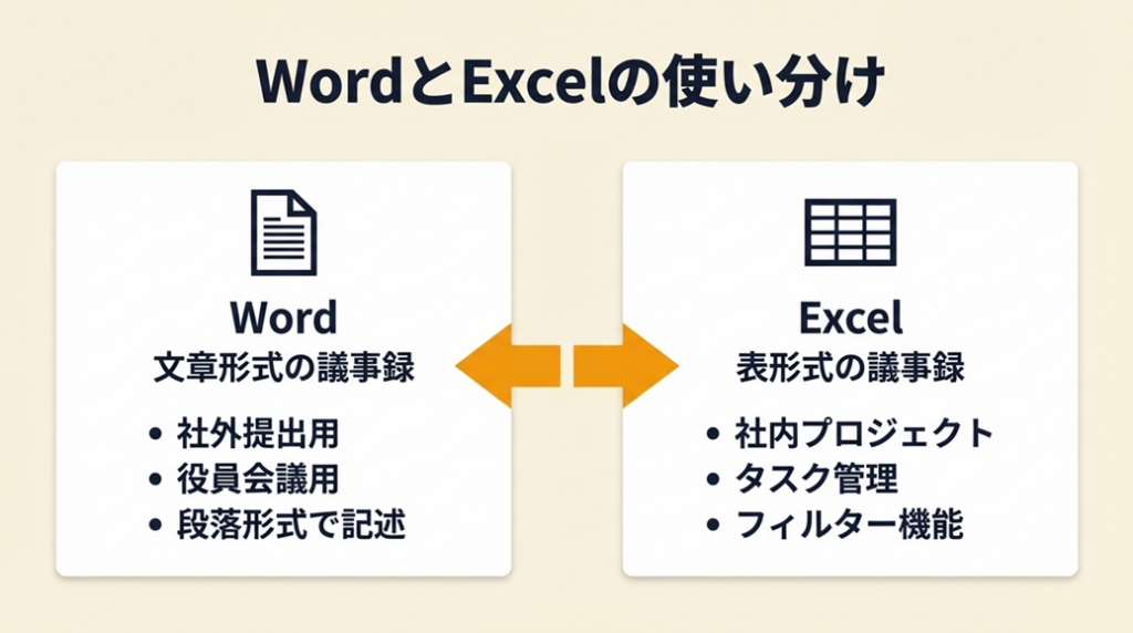 Wordは文章として議事録を読ませる場面に最適で、発言概要や決定事項を段落形式で記述したい社外提出用・役員会議用に向いています。Excelはタスク管理・担当者・期限を表形式で一覧管理したい社内プロジェクト定例に向いており、フィルター機能で未完了タスクだけ抽出する使い方も可能です。「外に出す資料はWord、内部管理はExcel」という二刀流運用が効率的です。