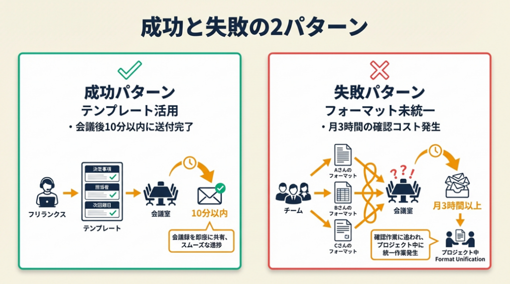 複数のフリーランスが関わるプロジェクトで、各自が異なるテンプレートを使用したケースです。議事録のファイル名・項目・形式がバラバラで、過去の決定事項を検索するたびに全員に確認が必要になりました。最終的に月3時間以上の確認コストが発生し、プロジェクト途中でフォーマット統一の再設定を強いられました。