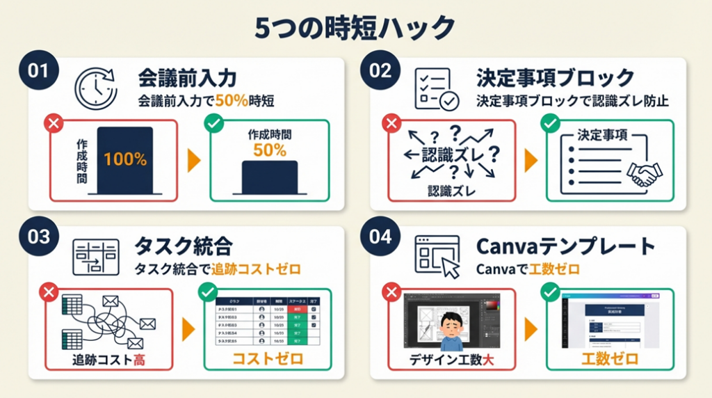 ハック1: 会議前入力テンプレートで議事録作成時間を50%削減