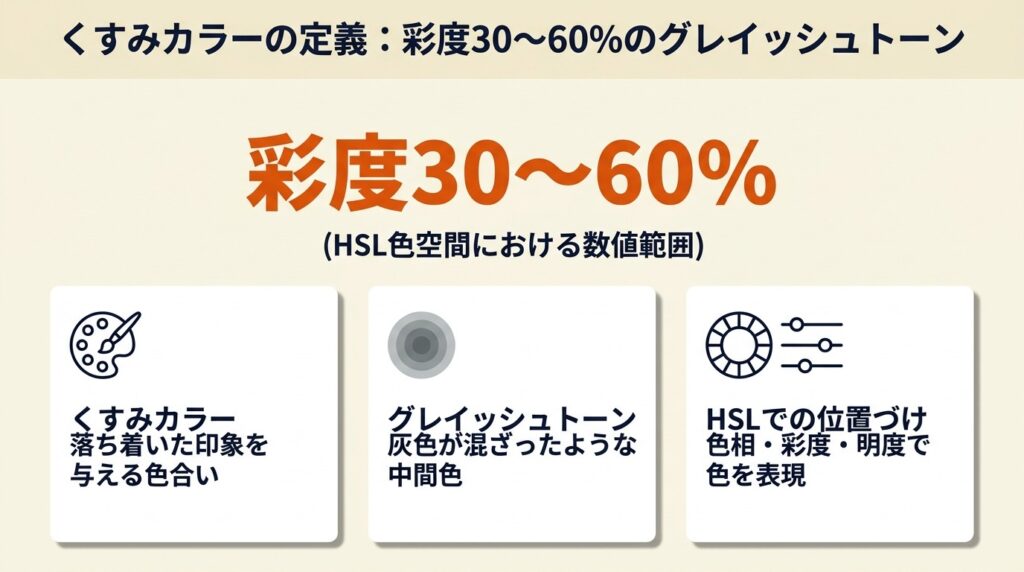 定義を整理してから配色ルールに進みます。「くすみカラーって結局どんな色なの?」という疑問は、HSLの数値で見ると一発で解決します。