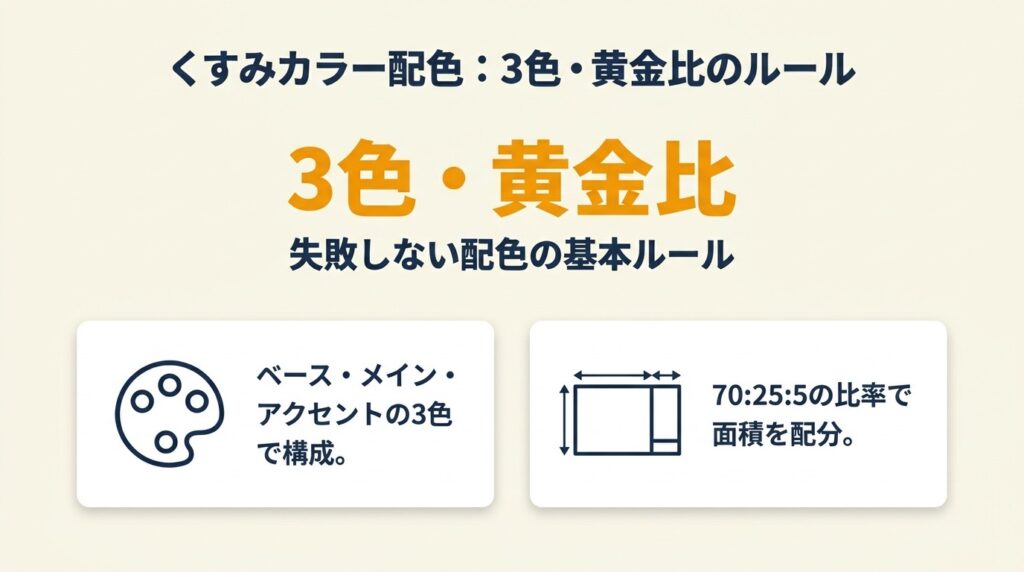 | 配色ルールを先に把握したい | くすみカラー配色は3色・黄金比で決まる | 5分 |