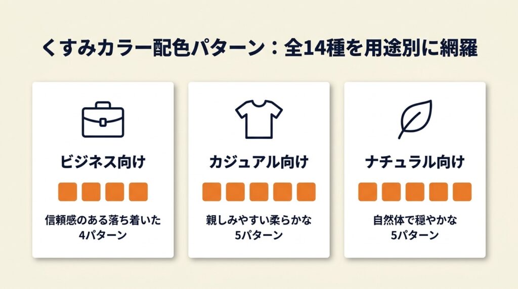 ▶ 今すぐやること: 14パターンから用途に合う1セットを選び、カラーコードをメモ帳またはデザインツールにコピーしてください(3分)。まず1パターン試すだけで全体の方向性が決まります。