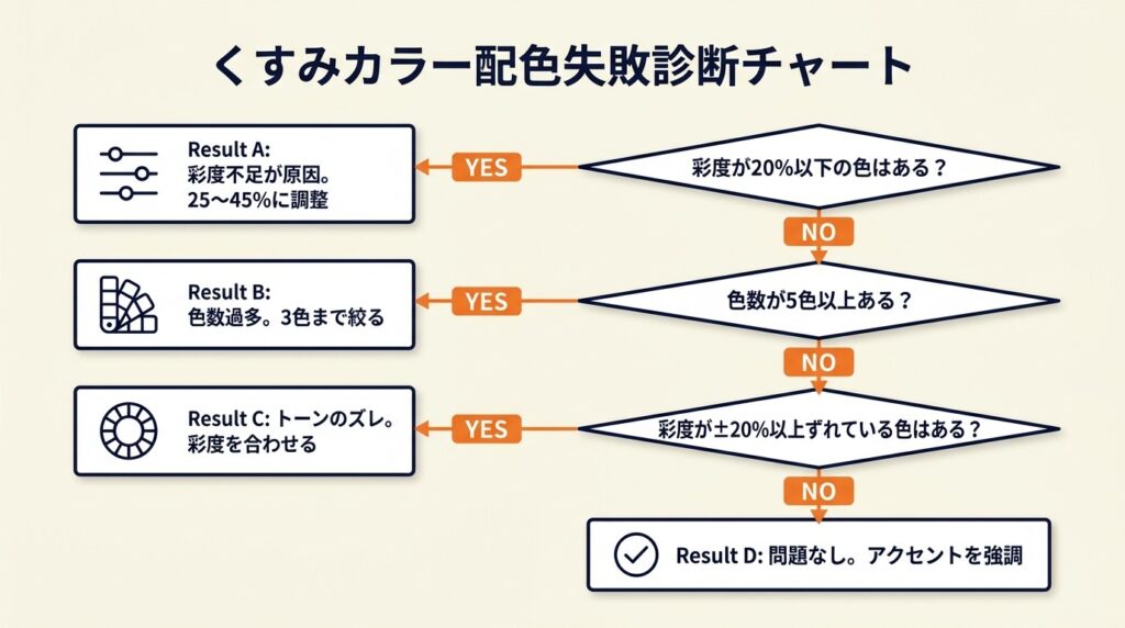 くすみカラーの最大のリスクは、地味・古臭い印象になることです。境界線は「彩度が20%以下まで落ちているかどうか」と「複数のくすみ色のトーンがバラバラかどうか」の2点にあります。彩度20%以下になると色みがほぼ消えてグレーに近くなり、くすみ感が出る前に濁った印象になります。またトーン(明度と彩度の組み合わせ)が異なるくすみ色を並べると、統一感がなく安っぽく見えます。
