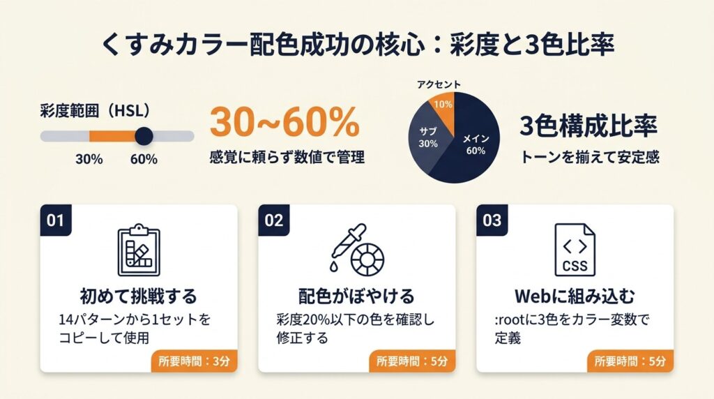 くすみカラー配色で失敗しない核心は、使う色の彩度を30〜60%に収め、3色構成(メイン60%・サブ30%・アクセント10%)を守るだけです。色の知識がなくても、数値で管理すれば感覚に頼らず安定した配色が作れます。カラーコードはこの記事の14パターンからそのまま使え、HSLの彩度スライダーを動かすだけで自分の用途に合わせた微調整が可能です。