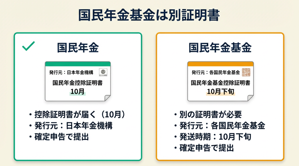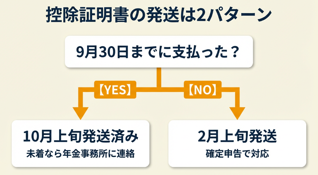 控除証明書は10月上旬に発送され、紛失時は年金事務所で再発行できます。国民年金基金の掛金も社会保険料控除の対象で、別の控除証明書が10月下旬に発送されます。年末調整に間に合わない場合は、確定申告で還付を受けられます。