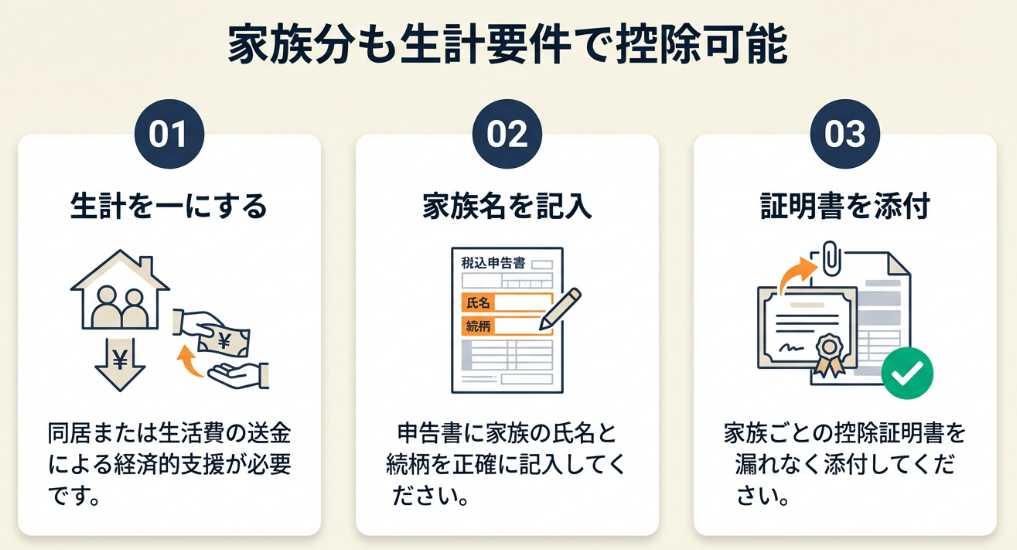 • 家族(配偶者・子ども等)の国民年金保険料を「生計を一にする」状態で代わりに支払っている