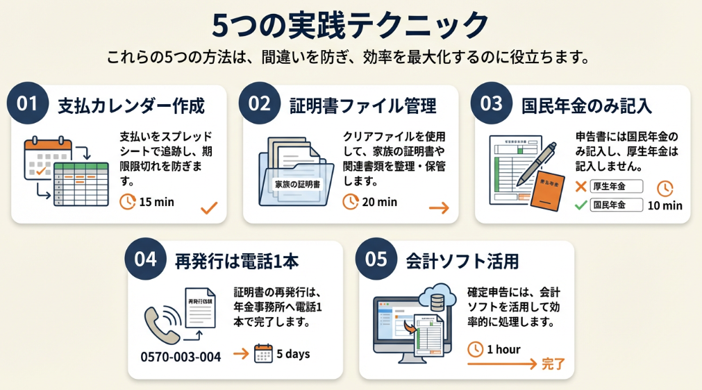 【なぜ効くのか】国民年金は前納制度があり、4月に1年分を支払うケースもあります。この場合、控除証明書の「納付見込額」と実際の支払額が異なる場合があるため、カレンダーで可視化すれば正確な控除額を把握できます。