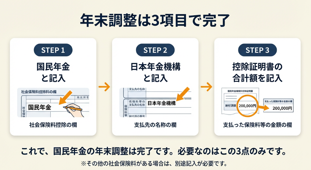 国民年金保険料は支払った全額が社会保険料控除の対象で、年末調整では「国民年金」「日本年金機構」「支払額」を記入し、控除証明書を添付すれば完了します。年途中の就職・転職や家族分の支払いがあれば、必ず申告してください。