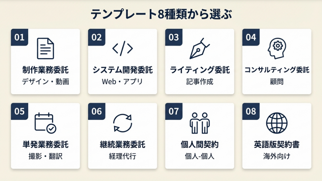 「自分の案件がどの契約類型に当たるか」を確認することが、正しいテンプレート選びの第一歩です。類型を誤ったまま同じ雛形を使い回すと、条項の欠落やトラブルの原因になります。