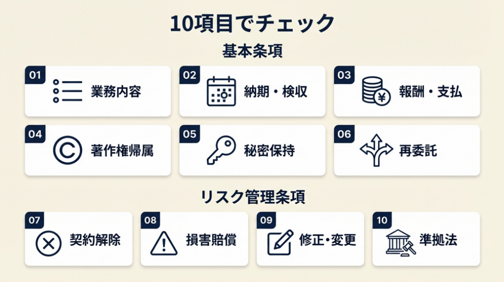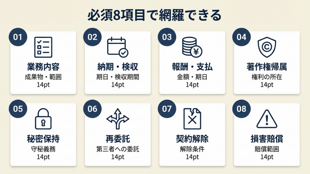 実務上のトラブルの9割は特定の条項の欠落から生じています。8項目を押さえれば大半のリスクをカバーできます。