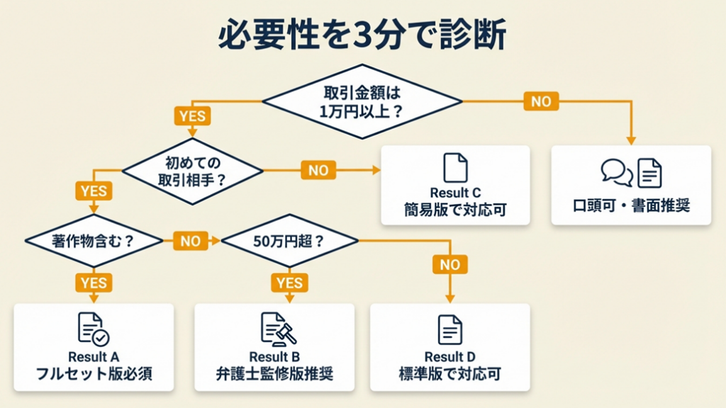 過去に実績のある取引相手であれば、業務内容・報酬・納期の3点を明記した簡易版で十分機能します。案件内容が大幅に変わる場合は改めて締結してください。