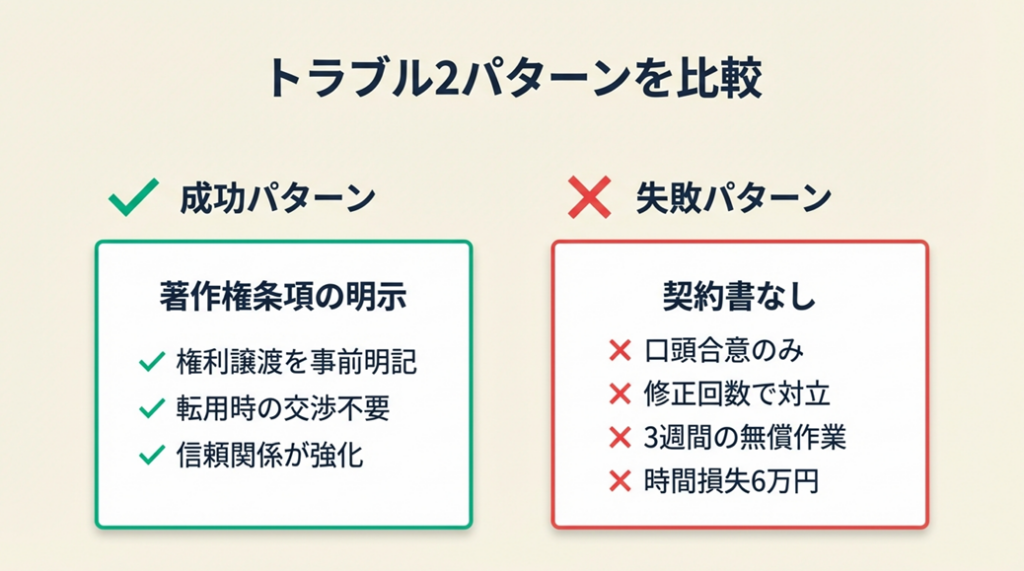 実際にトラブルが起きたケースと防いだケースを比較することで、どの条項が「守り」として機能するかが明確になります。
