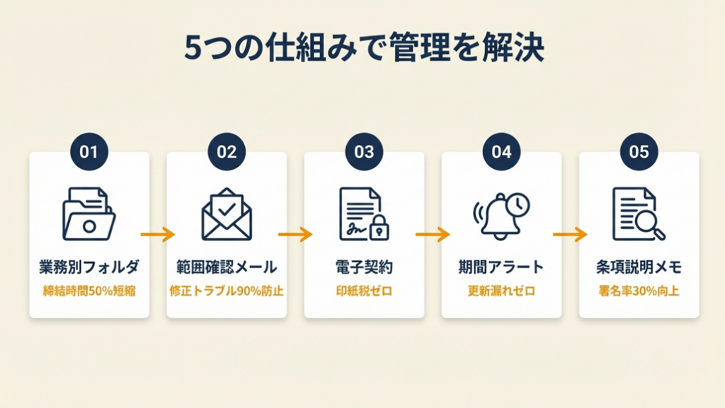 - 【なぜ効くのか】: 紙契約では「印刷→押印→郵送→返送→保管」という5ステップのうち3ステップが物理的な作業です。電子契約はこの3ステップをなくすため、事務作業の構造が根本から変わります。締結済みデータがクラウドに自動保存されることで「5年前の契約書が見当たらない」というリスクも構造的になくなります。