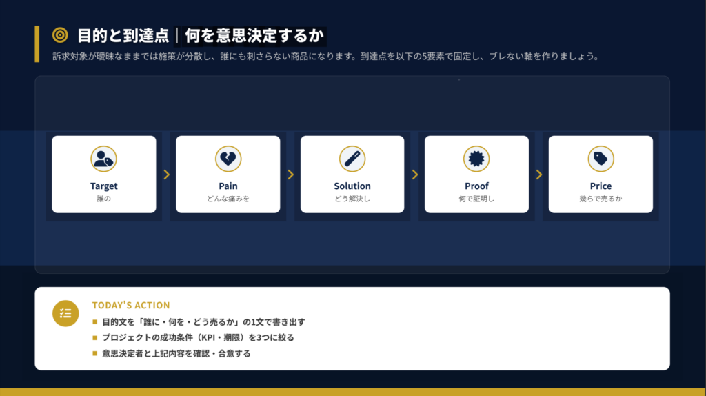 ポジショニング設計の出発点は、以下の5要素を1文で言語化することです。これがブレると、後工程すべてがやり直しになります。