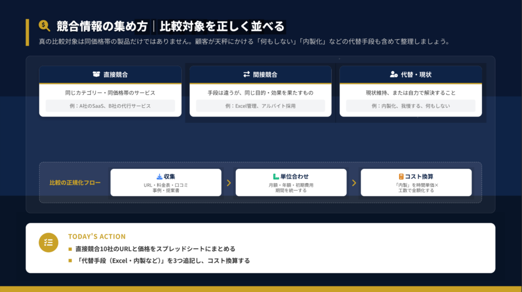 真の比較対象は3種類に分類できます。「何もしない」「内製化」などの代替手段も含めて整理することで、より正確な競争環境が見えてきます。