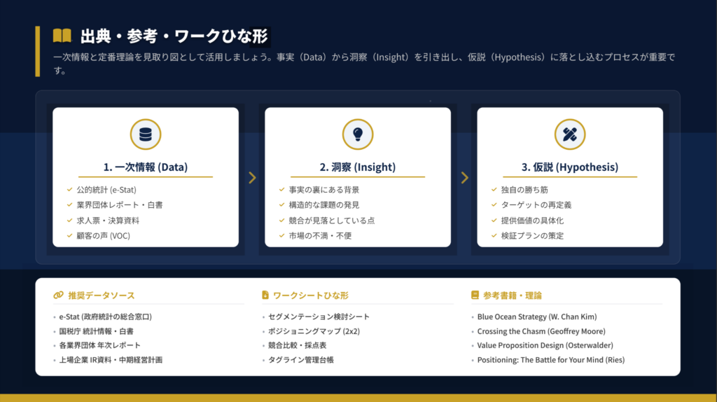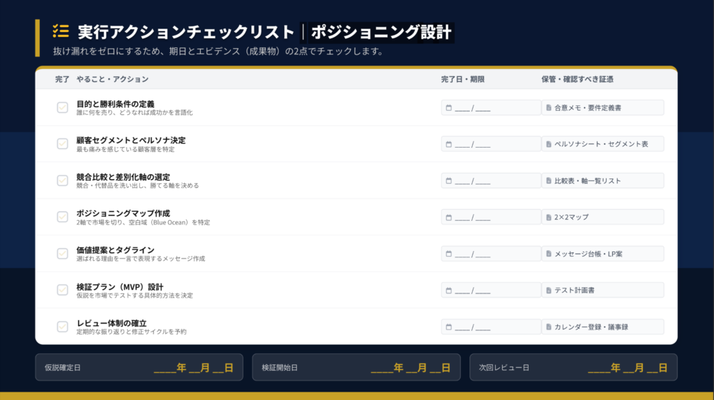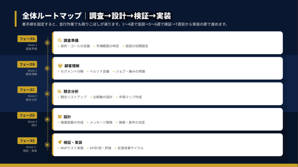 本記事で解説した流れを整理すると、Week 1で目的と市場を定義し、Week 2で顧客セグメントとペルソナを決定、Week 3で競合比較と差別化軸を選定、Week 4でポジショニングマップと価値提案を設計します。Week 5〜6で検証プランを実行し、Week 7から本格実装に入ります。