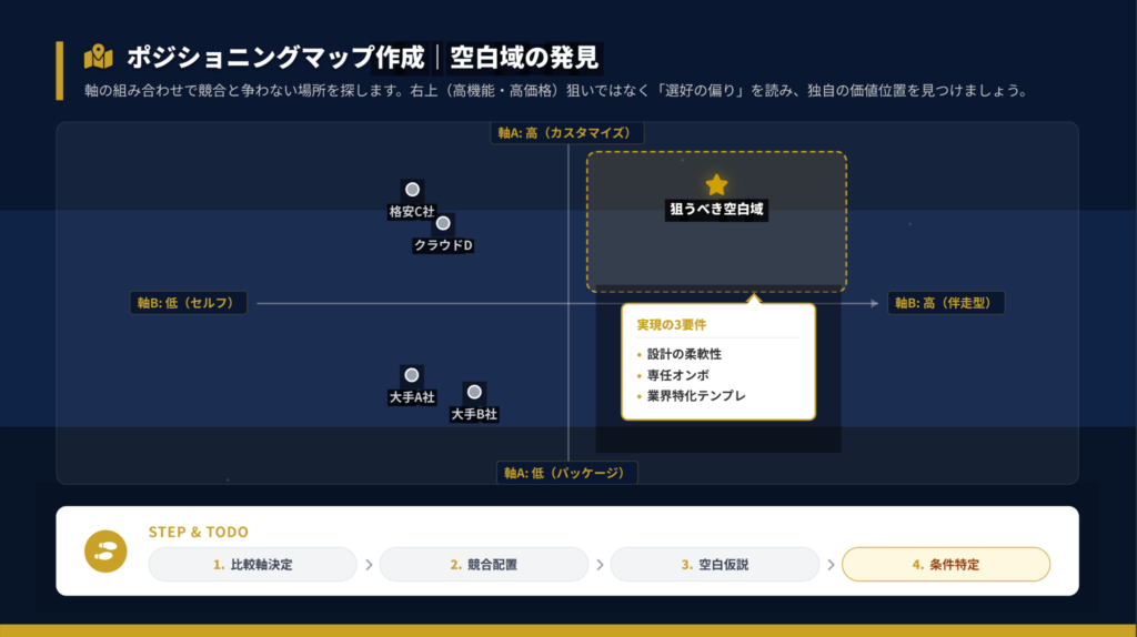 STEP 3: 空白仮説 競合がいない「空白域」を特定し、その理由を考えます。