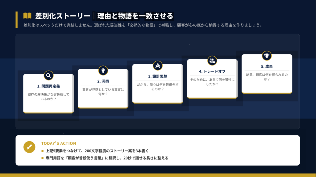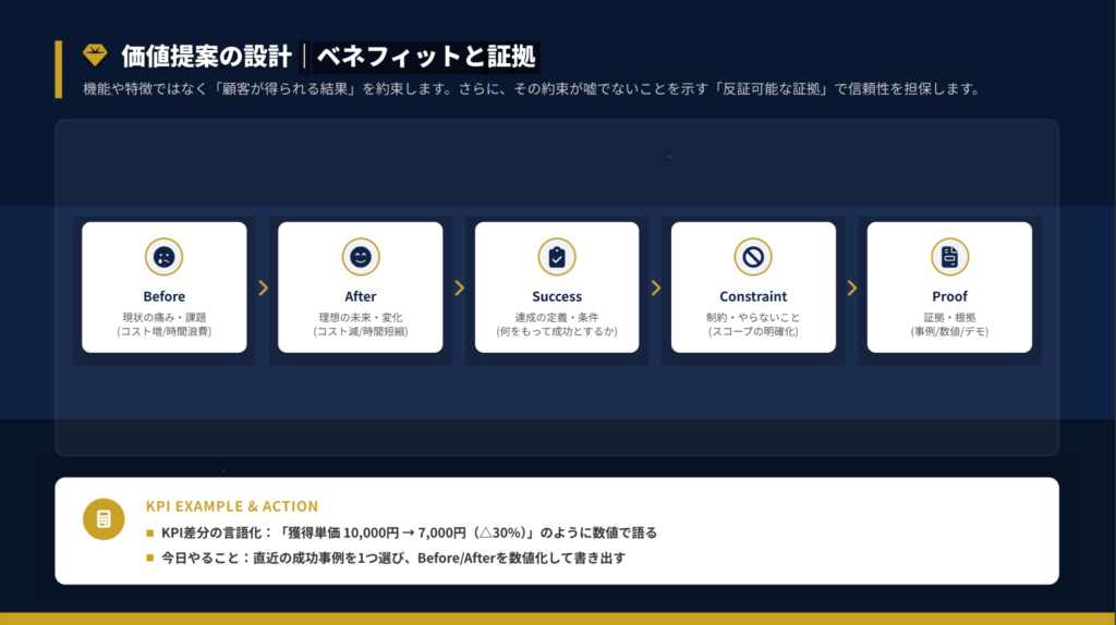 空白域を特定したら、そこで提供する価値を5要素で設計します。機能や特徴ではなく「顧客が得られる結果」を約束し、「反証可能な証拠」で信頼性を担保するのがポイントです。