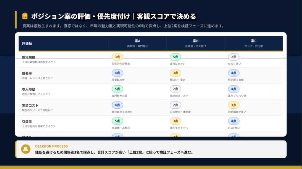 ポジション案の評価は6軸で行います。市場の魅力度と実現可能性をスコア化し、上位2案を検証フェーズに進めましょう。