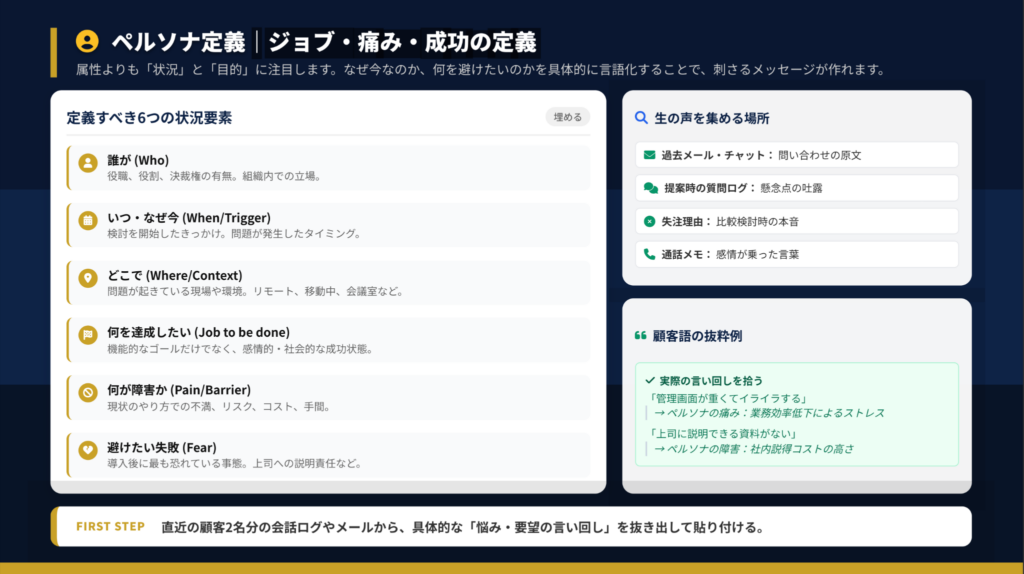 顧客の生の声を拾う場所として、過去のメール・チャット、提案時の質問ログ、失注理由、通話メモが特に有効です。「管理画面が重くてイライラする」という言葉から「業務効率低下によるストレス」という痛みを抽出するように、顧客語をそのまま活用しましょう。