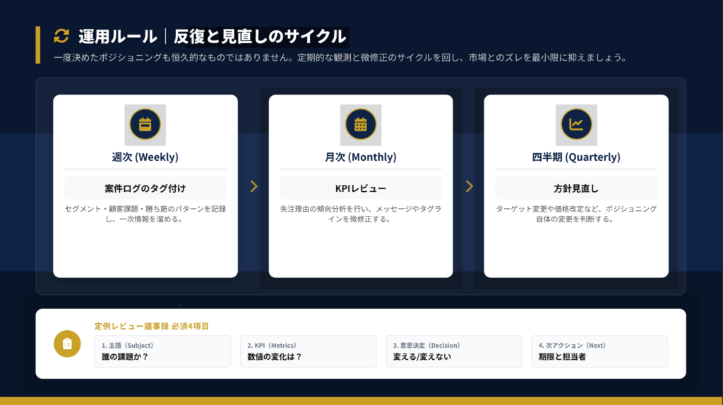 ポジショニング設計は「一度決めたら終わり」ではありません。市場は常に変化し、競合も動きます。週次・月次・四半期のレビューサイクルを回し、自分のポジションを磨き続けてください。「選ばれる理由」を言語化できれば、営業の迷いが消え、価格競争から抜け出し、理想の顧客と出会えるようになります。