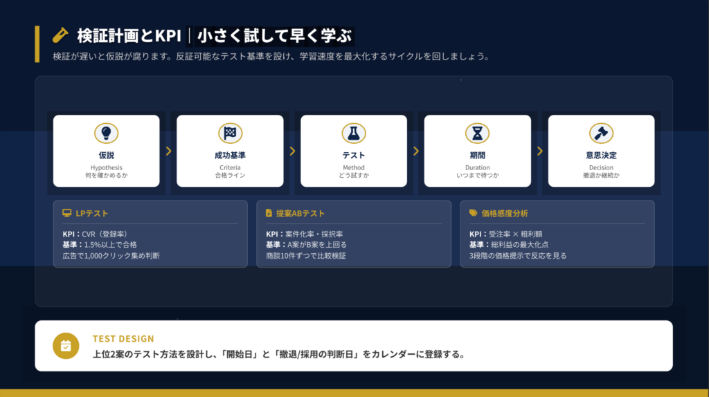 検証は5段階で実行します。反証可能なテスト基準を設け、学習速度を最大化するサイクルを回しましょう。